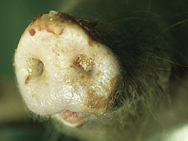 Vesículas rotas en proceso de cicatrización en el hocico. EVC experimental.