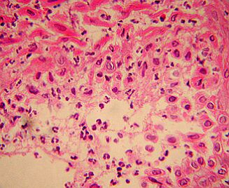 Vesícula con células epiteliales con degeneración hidrópica e infiltrado inflamatorio abundante formado por neutrófilos y macrófagos, coincidente con una infección bacteriana secundaria. H-E x 400. |