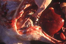 Lesiones: Evidente pericarditis fibrinosa y hepatomegalia