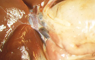 Fig. 10: Ganglios gastrohepáticos hemorrágicos en la PPA aguda, producida por un aislado de alta virulencia.