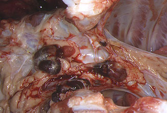 Fig. 29: Ganglios mediastínicos hipertrofiados y parcialmente hemorrágicos.