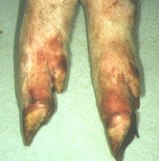 Fig. 3: Piel, extremidades posteriores. Áreas cianóticas y hematomas en la parte distal.