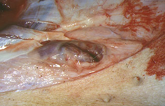 Fig. 30: Ganglio inguinal hemorrágico y edematoso.