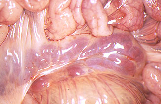 Fig. 31: Ganglios mesentéricos hiperémicos e hipertrofiados.