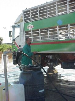el personal de la granja entre dentro del camión.